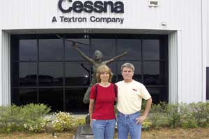 | Behind us is a statue of Clyde Cessna as a boy. At the age of 32 he designed and built his own airplane, and then taught himself to fly! | Steve checks in with Dale, who is chief of security. Security is tight there. We had to wear visitor passes and be escorted everywhere we went. The buildings have cameras mounted outside and security constantly patrols the premises. | |