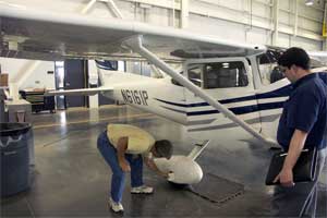 | This is the flight building. Steve begins his very thorough check of the airplane. | I mean very thorough. On the right is Tim, the delivery pilot who took us up on the first flight to check that everything was in working order. | |