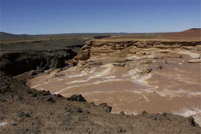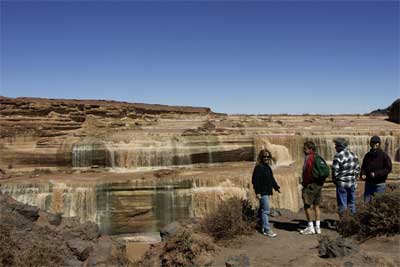 Here's a peek at the peaks of the San Francisco Mountains. On the right is Humphrey (12,633') and on the left is Agassiz (12,356'). Humphrey is the highest peak in Arizona. | By clicking on this picture you can go to a 15 second movie of the falls. It's a Macromedia Flash movie. Click here to download the free Flash Player, if you don't already have it. The movie really gives you a great sense of being there because you can hear (be sure your sound is on) the roar of the falls. You'll also hear Kevon talking about a tire he's watching going around and around a vortex. | ||
