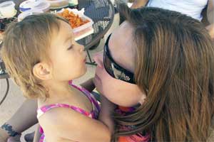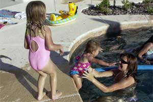 | The girls jump off the side into Mom's arms. Abby decided it was better to "jump" from a sitting position. But they had fun! | |||