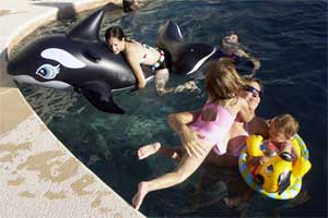 cooled off.   By the late afternoon when everyone came, Steve had the water temperature up to 80 degrees. At first it seemed "cold" but the kids spent several hours playing, so I guess it wasn't too bad. We invited Jeff's parents and his sisters and a friend of theirs. The pool really got a workout!  |